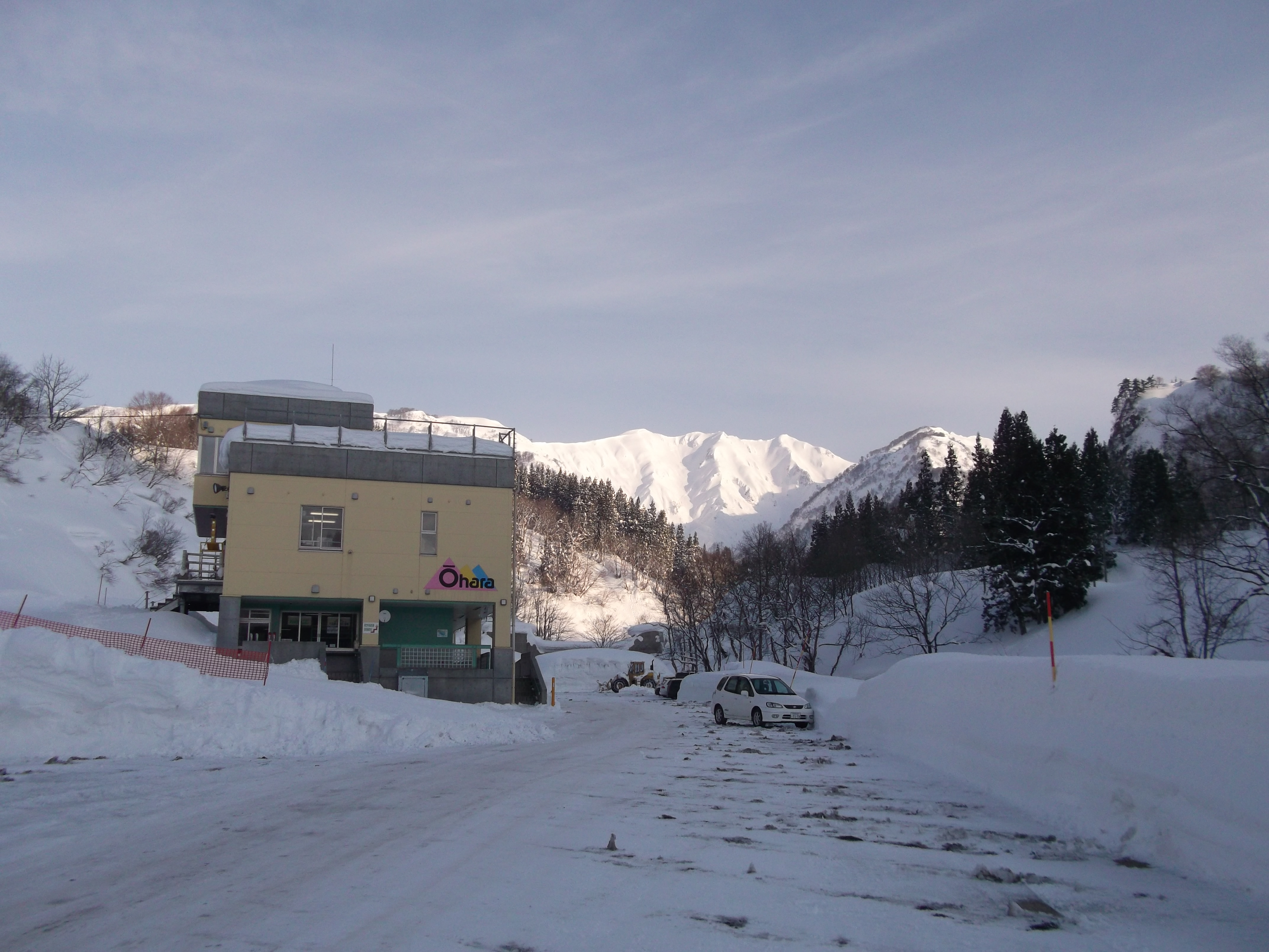 駐車場から魚沼大原スキー場レストハウス(左)と守門岳(奥の白い山)