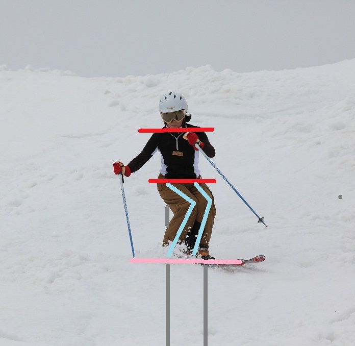 このバランスが第一条件として、片足を片足へ寄せて平行にしたバランス。 その際に、ハの字で作った腰の位置と向き、上半身の位置と向きが変形しない事。 その為には、ターン内側の肩と腰の位置から、足元へ力を通す事が出来てこなければそのバランスは確保出来るものではありません。 このバランスは中ターン〜のターンに必要な考え方です。