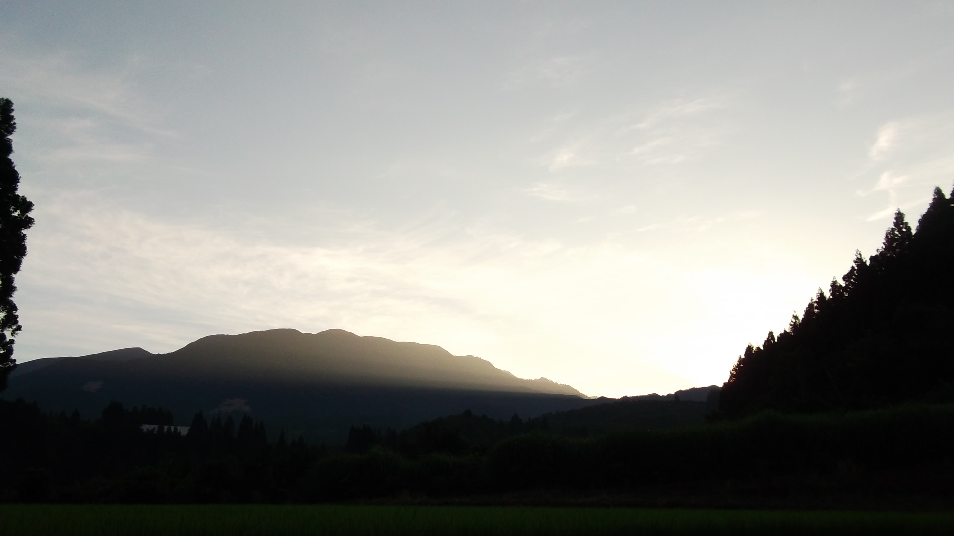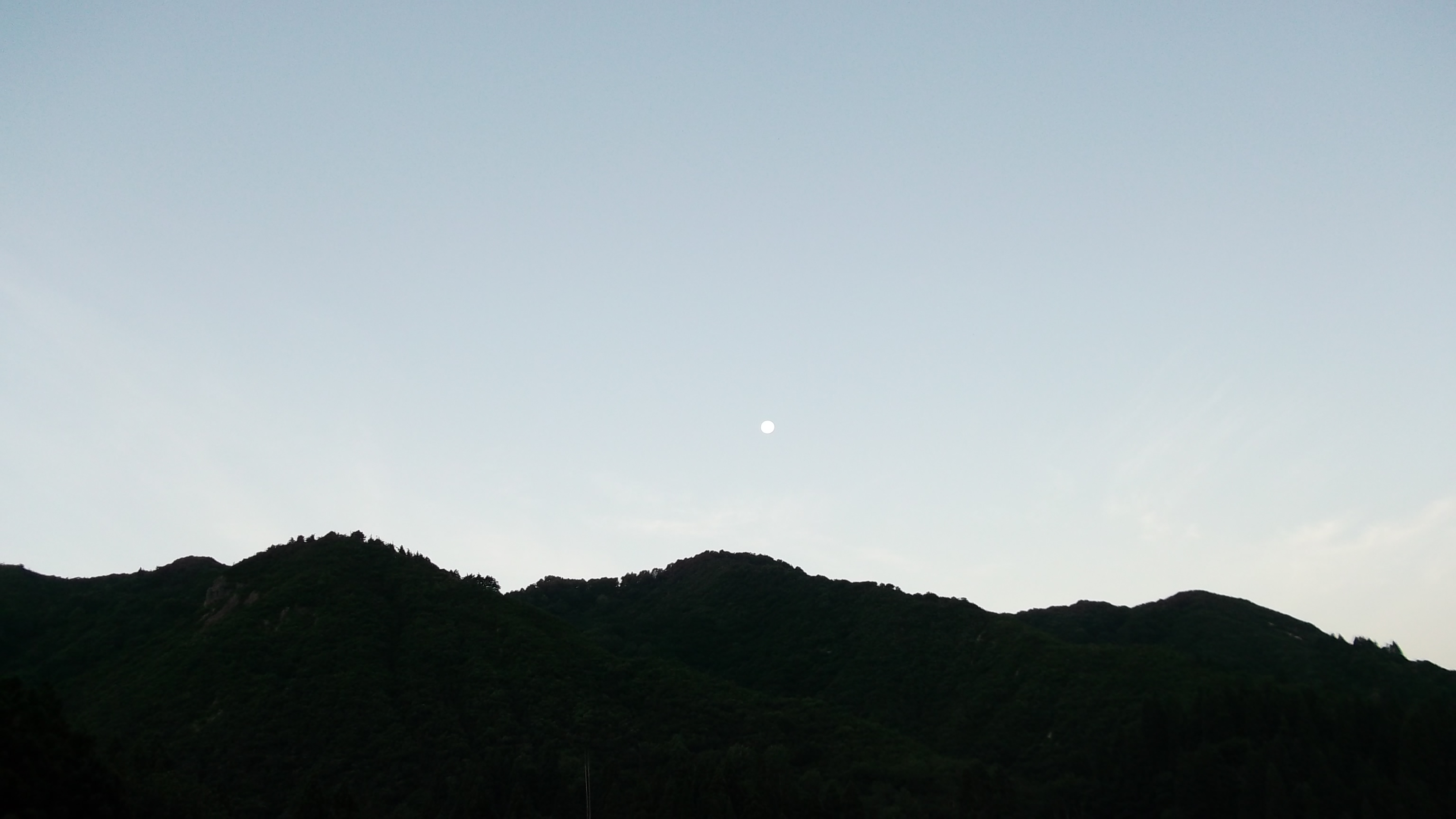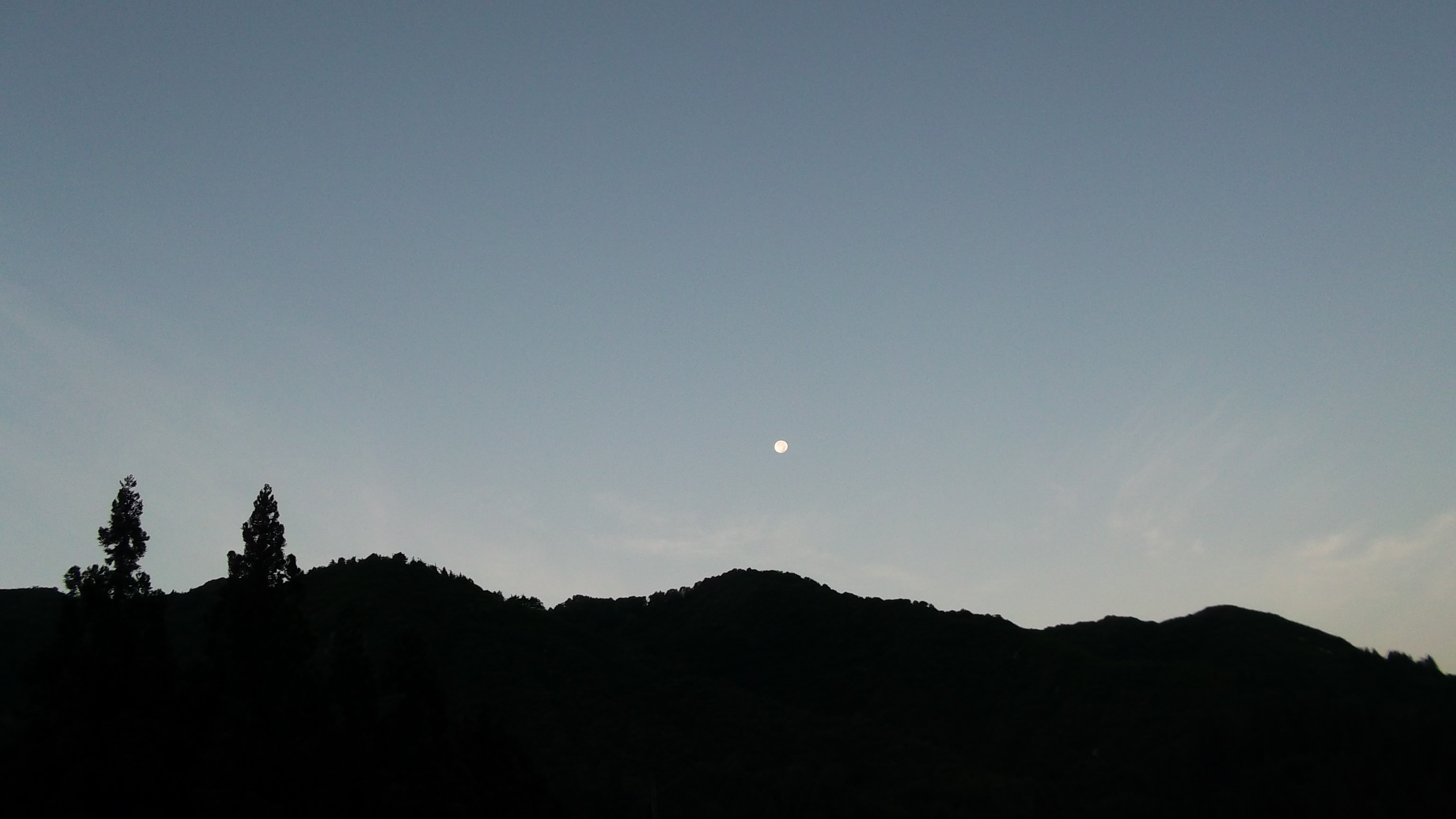 太陽が上がる直前。 そして、東から太陽が上がって、西の山に日が差し始めました。 お月さまもくっきり。